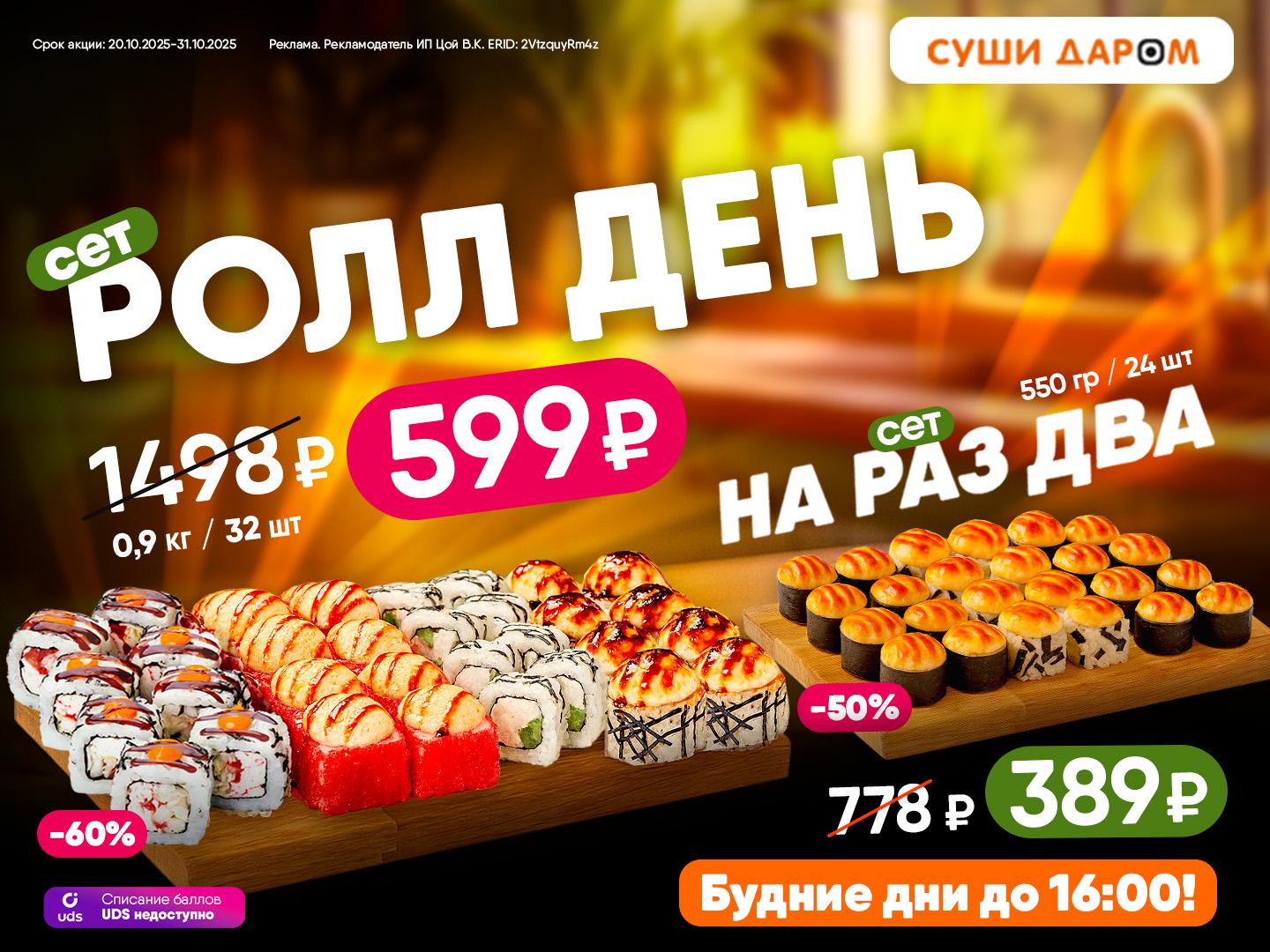 [emoji=:heart_eyes:]Представляем вашему вниманию бомбические сеты "РоллДень" и сет "На раз два"[br]Созданы для того, чтобы твой обед был идеальным![br]Берёшь сытный "РоллДень" — добавляешь лёгкий запеченный сет "На раз два".[br]И получаешь комбо, где вместе реально намного вкуснее [emoji=:yum:][br][br] Не пропусти - только по будням, только до 16:00[br][emoji=:orange_heart:] Сет "РоллДень" — 0,9 кг всего за 599 ₽[br][emoji=:orange_heart:] Сет "На раз два" — 550 г всего 389 ₽[br][br] Срок действия акции с 20.10.2025- 31.10.2025 будние дни до 16:00[br]*Списание баллов UDS невозможно.[br]**Количество товара ограничено, наличие товара уточняйте у кассира по телефону 8 (925) 373-05-55
